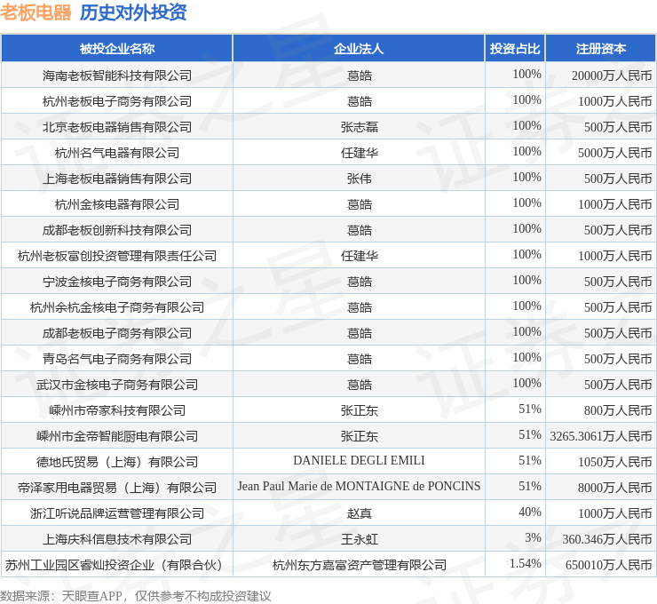 证券之星消息,根据天眼查APP显示,老板电器(002508.SZ)新增一起对外投资事件,被投资公司为海南老板智能科技有限公司,法定代表人葛皓,投资占比为100%。该公司从事电气机械和器材制造业,注册资本为20000万人民币。目前,老板电器共存在对外投资20项,详见下表: