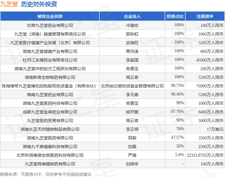 证券之星消息,根据天眼查APP显示,九芝堂(000989.SZ)新增一起对外投资事件,被投资公司为湖南九千唐健康科技有限公司,法定代表人刘磊,投资占比为20%。该公司从事商务服务业,注册资本为2500万人民币。目前,九芝堂共存在对外投资17项,详见下表: