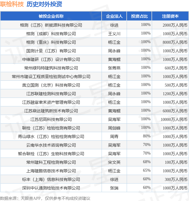 证券之星消息,根据天眼查APP显示,联检科技(301115.SZ)新增一起对外投资事件,被投资公司为江苏国正检测有限公司,法定代表人徐淑彩,投资占比为2%。该公司从事专业技术服务业,注册资本为1020.4082万人民币。目前,联检科技共存在对外投资39项,投资占比前20的项目见下表: