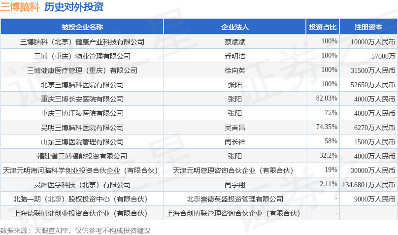证券之星消息,根据天眼查APP显示,三博脑科(301293.SZ)新增一起对外投资事件,被投资公司为天津元明海河脑科学创业投资合伙企业(有限合伙),法定代表人天津元明管理咨询合伙企业(有限合伙),投资占比为19%。该公司从事资本市场服务,注册资本为30000万人民币。目前,三博脑科共存在对外投资13项,详见下表:
