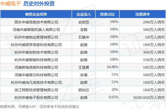 证券之星消息,根据天眼查APP显示,中威电子(300270.SZ)新增一起对外投资事件,被投资公司为河南中威算芯科技有限公司,法定代表人朱博,投资占比为51%。该公司从事软件和信息技术服务业,注册资本为5000万人民币。目前,中威电子共存在对外投资11项,详见下表: