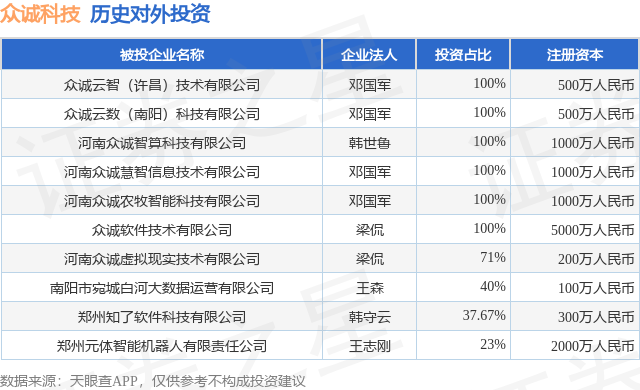 通过天眼查大数据分析,河南众诚信息科技股份有限公司共对外投资了9家企业,参与招投标项目950次;财产线索方面有商标信息43条,专利信息44条,著作权信息280条;此外企业还拥有行政许可7个。据2024年报数据,众诚科技长期股权投资63.38万元,同比增28.21%。