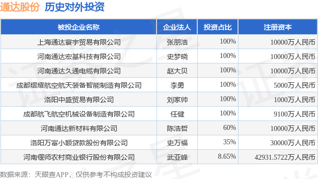 证券之星消息,根据天眼查APP显示,通达股份(002560.SZ)新增一起对外投资事件,被投资公司为上海通达寰宇贸易有限公司,法定代表人张朋浩,投资占比为100%。该公司从事批发业,注册资本为10000万人民币。目前,通达股份共存在对外投资9项,详见下表: