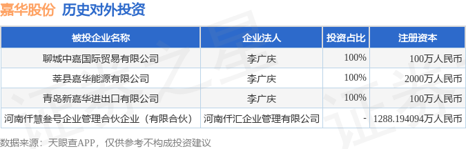 证券之星消息,根据天眼查APP显示,嘉华股份(603182.SH)新增一起对外投资事件,被投资公司为河南仟慧叁号企业管理合伙企业(有限合伙),法定代表人河南仟汇企业管理有限公司,投资占比为-。该公司从事商务服务业,注册资本为1288.194094万人民币。目前,嘉华股份共存在对外投资4项,详见下表: