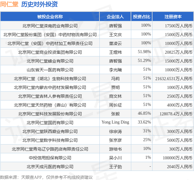 证券之星消息,根据天眼查APP显示,同仁堂(600085.SH)新增一起对外投资事件,被投资公司为北京天成元医药有限公司,法定代表人王子勍,投资占比为-。该公司从事批发业,注册资本为2040万人民币。目前,同仁堂共存在对外投资17项,详见下表: