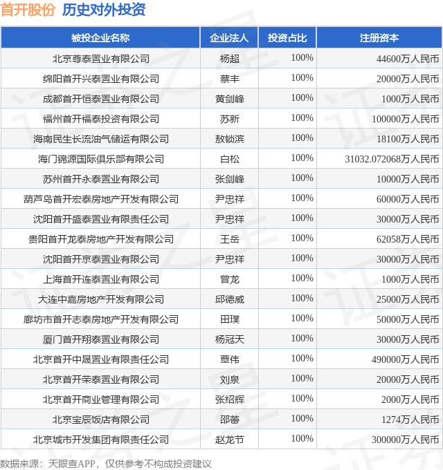 证券之星消息,根据天眼查APP显示,首开股份(600376.SH)新增一起对外投资事件,被投资公司为北京尊泰置业有限公司,法定代表人杨超,投资占比为100%。该公司从事房地产业,注册资本为44600万人民币。目前,首开股份共存在对外投资184项,投资占比前20的项目见下表: