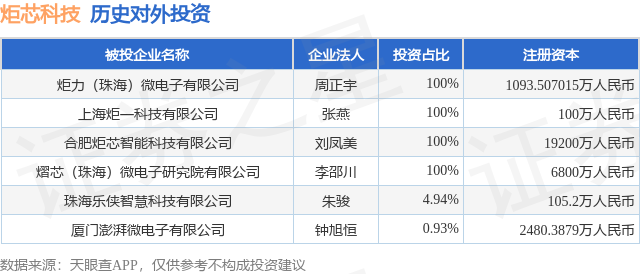 证券之星消息,根据天眼查APP显示,炬芯科技(688049.SH)新增一起对外投资事件,被投资公司为厦门澎湃微电子有限公司,法定代表人钟旭恒,投资占比为0.93%。该公司从事软件和信息技术服务业,注册资本为2480.3879万人民币。目前,炬芯科技共存在对外投资6项,详见下表: