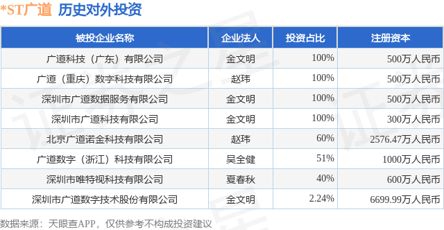 证券之星消息,根据天眼查APP显示,*ST广道(920680.BJ)新增一起对外投资事件,被投资公司为广道科技(广东)有限公司,法定代表人金文明,投资占比为100%。该公司从事软件和信息技术服务业,注册资本为500万人民币。目前,*ST广道共存在对外投资8项,详见下表: