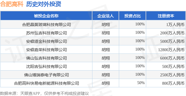 证券之星消息,根据天眼查APP显示,合肥高科(920718.BJ)新增一起对外投资事件,被投资公司为合肥晶翼玻璃科技有限公司,法定代表人胡翔,投资占比为100%。该公司从事科技推广和应用服务业,注册资本为1万人民币。目前,合肥高科共存在对外投资8项,详见下表: