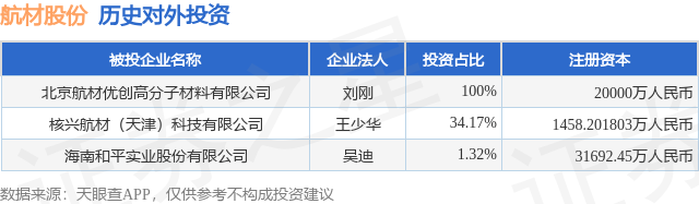 证券之星消息,根据天眼查APP显示,航材股份(688563.SH)新增一起对外投资事件,被投资公司为海南和平实业股份有限公司,法定代表人吴迪,投资占比为1.32%。该公司从事房地产业,注册资本为31692.45万人民币。目前,航材股份共存在对外投资3项,详见下表:
