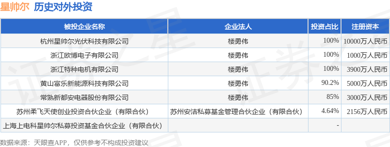 证券之星消息,根据天眼查APP显示,星帅尔(002860.SZ)新增一起对外投资事件,被投资公司为上海上电科星帅尔私募投资基金合伙企业(有限合伙),法定代表人,投资占比为-。该公司从事资本市场服务,注册资本为。目前,星帅尔共存在对外投资7项,详见下表: