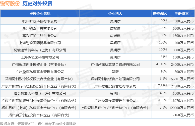 证券之星消息,根据天眼查APP显示,锐奇股份(300126.SZ)新增一起对外投资事件,被投资公司为扬州启云创业投资合伙企业(有限合伙),法定代表人,投资占比为-。该公司从事资本市场服务,注册资本为2160万人民币。目前,锐奇股份共存在对外投资14项,详见下表: