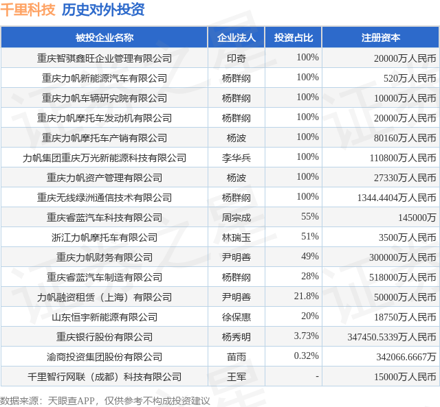 证券之星消息,根据天眼查APP显示,千里科技(601777.SH)新增一起对外投资事件,被投资公司为千里智行网联(成都)科技有限公司,法定代表人王军,投资占比为-。该公司从事软件和信息技术服务业,注册资本为15000万人民币。目前,千里科技共存在对外投资17项,详见下表: