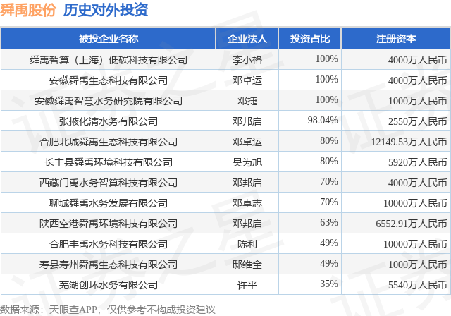 证券之星消息,根据天眼查APP显示,舜禹股份(301519.SZ)新增一起对外投资事件,被投资公司为舜禹智算(上海)低碳科技有限公司,法定代表人李小格,投资占比为100%。该公司从事软件和信息技术服务业,注册资本为4000万人民币。目前,舜禹股份共存在对外投资12项,详见下表:
