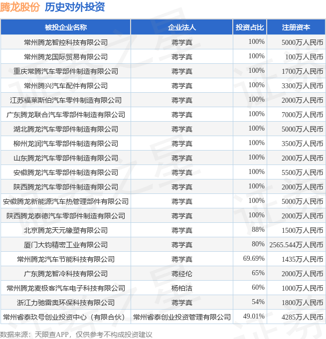 证券之星消息,根据天眼查APP显示,腾龙股份(603158.SH)新增一起对外投资事件,被投资公司为常州腾龙智控科技有限公司,法定代表人蒋学真,投资占比为100%。该公司从事科技推广和应用服务业,注册资本为5000万人民币。目前,腾龙股份共存在对外投资26项,投资占比前20的项目见下表: