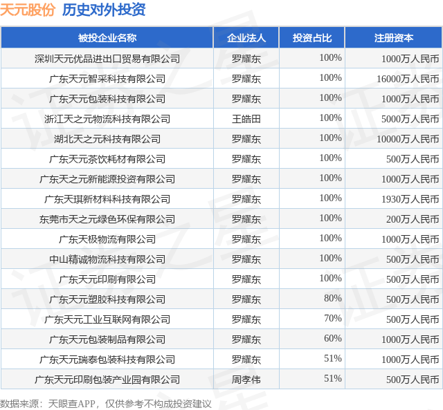 证券之星消息,根据天眼查APP显示,天元股份(003003.SZ)新增一起对外投资事件,被投资公司为深圳天元优品进出口贸易有限公司,法定代表人罗耀东,投资占比为100%。该公司从事多式联运和运输代理业,注册资本为1000万人民币。目前,天元股份共存在对外投资17项,详见下表: