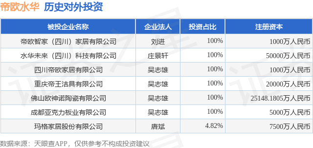 证券之星消息,根据天眼查APP显示,帝欧水华(002798.SZ)新增一起对外投资事件,被投资公司为帝欧智家(四川)家居有限公司,法定代表人刘进,投资占比为100%。该公司从事家具制造业,注册资本为1000万人民币。目前,帝欧水华共存在对外投资7项,详见下表:
