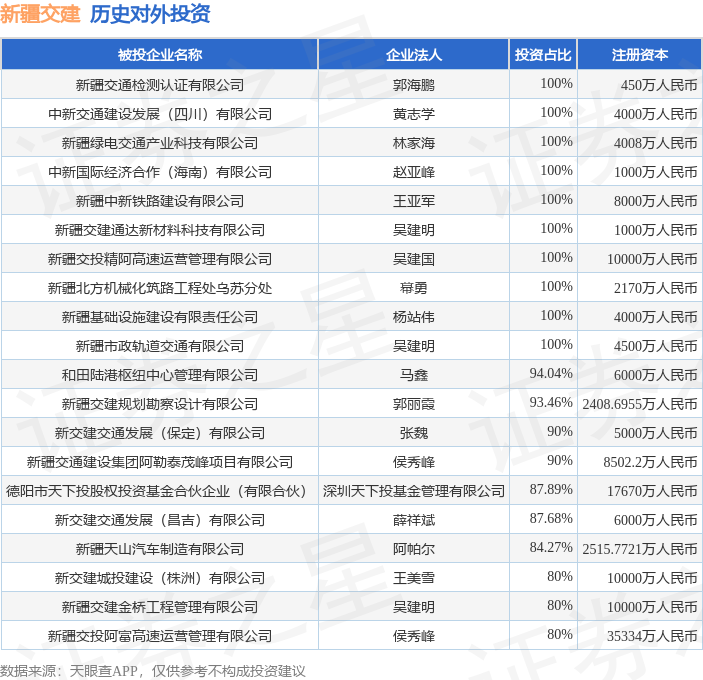 证券之星消息,根据天眼查APP显示,新疆交建(002941.SZ)新增一起对外投资事件,被投资公司为新疆敦若公路投资发展有限责任公司,法定代表人陈望平,投资占比为25%。该公司从事土木工程建筑业,注册资本为10000万人民币。目前,新疆交建共存在对外投资51项,投资占比前20的项目见下表: