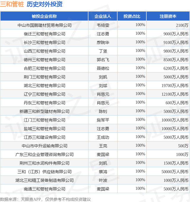 证券之星消息,根据天眼查APP显示,三和管桩(003037.SZ)新增一起对外投资事件,被投资公司为湖南三启新材料有限责任公司,法定代表人黄启忠,投资占比为40%。该公司从事化学原料和化学制品制造业,注册资本为15000万人民币。目前,三和管桩共存在对外投资33项,投资占比前20的项目见下表: