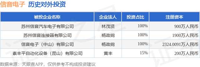 证券之星消息,根据天眼查APP显示,信音电子(301329.SZ)新增一起对外投资事件,被投资公司为素丰平自动化设备(昆山)有限公司,法定代表人黄丰,投资占比为15%。该公司从事通用设备制造业,注册资本为200万人民币。目前,信音电子共存在对外投资4项,详见下表: