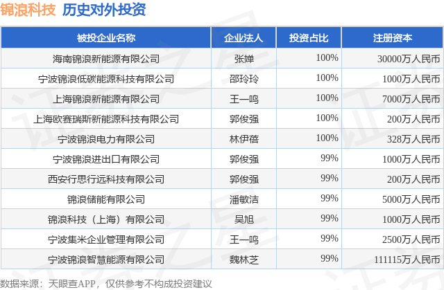 证券之星消息,根据天眼查APP显示,锦浪科技(300763.SZ)新增一起对外投资事件,被投资公司为宁波锦浪进出口有限公司,法定代表人郭俊强,投资占比为99%。该公司从事批发业,注册资本为1000万人民币。目前,锦浪科技共存在对外投资11项,详见下表: