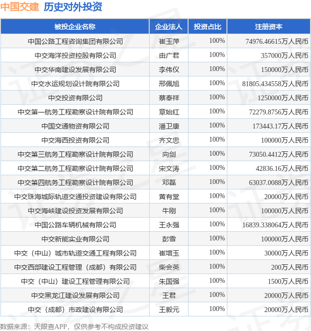 通过天眼查大数据分析,中国交通建设股份有限公司共对外投资了116家企业,参与招投标项目37512次;财产线索方面有商标信息187条,专利信息158条,著作权信息40条;此外企业还拥有行政许可96个。据2024年报数据,中国交建商誉53.0亿元,同比减2.84%。长期股权投资1143.72亿元,同比增0.79%。