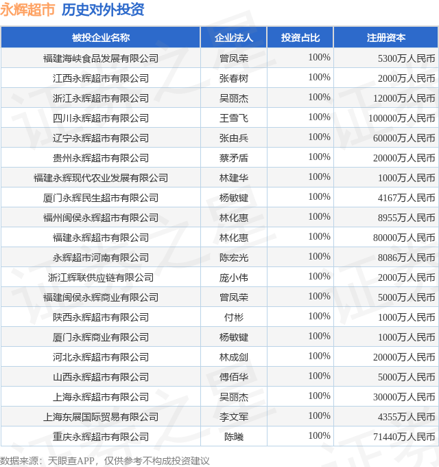 证券之星消息,根据天眼查APP显示,永辉超市(601933.SH)新增一起对外投资事件,被投资公司为北京永辉商贸有限公司,法定代表人杨子亮,投资占比为99%。该公司从事零售业,注册资本为1000万人民币。目前,永辉超市共存在对外投资69项,投资占比前20的项目见下表: