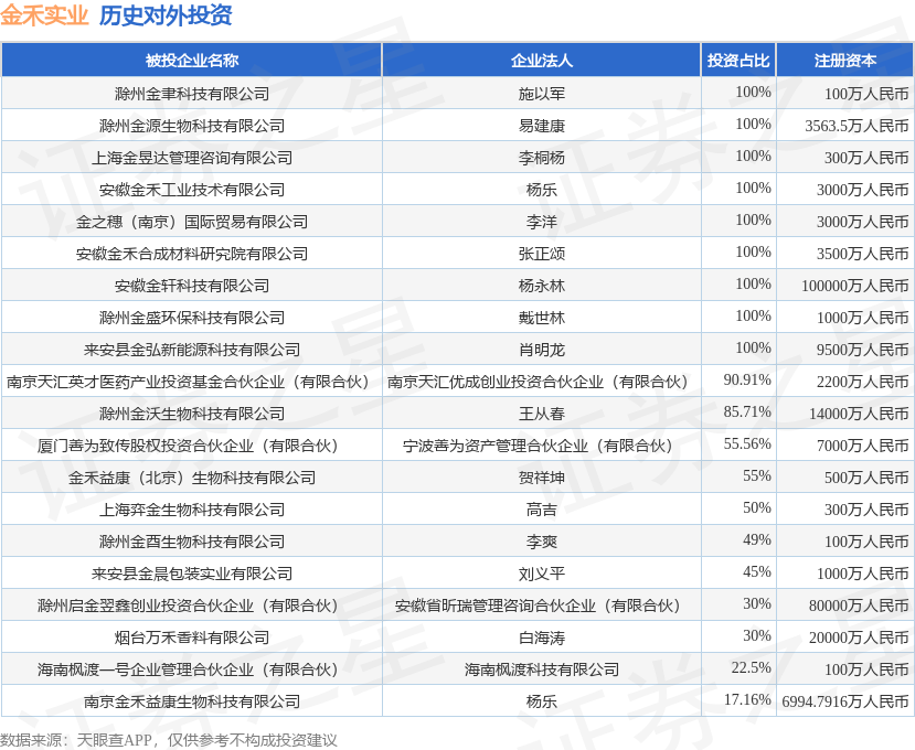 证券之星消息,根据天眼查APP显示,金禾实业(002597.SZ)新增一起对外投资事件,被投资公司为滁州金聿科技有限公司,法定代表人施以军,投资占比为100%。该公司从事科技推广和应用服务业,注册资本为100万人民币。目前,金禾实业共存在对外投资35项,投资占比前20的项目见下表: