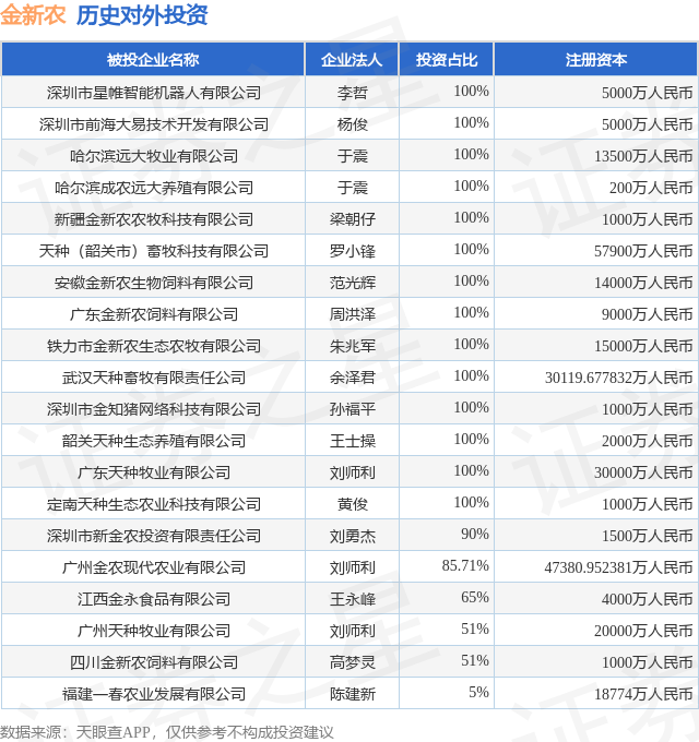 证券之星消息,根据天眼查APP显示,金新农(002548.SZ)新增一起对外投资事件,被投资公司为深圳市星帷智能机器人有限公司,法定代表人李哲,投资占比为100%。该公司从事计算机、通信和其他电子设备制造业,注册资本为5000万人民币。目前,金新农共存在对外投资22项,投资占比前20的项目见下表: