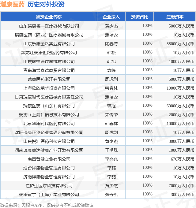 通过天眼查大数据分析,瑞康医药集团股份有限公司共对外投资了110家企业,参与招投标项目16734次;财产线索方面有商标信息159条,专利信息6条,著作权信息3条;此外企业还拥有行政许可28个。据2024年报数据,瑞康医药商誉1.47亿元,同比未变化。长期股权投资5.32亿元,同比减18.84%。