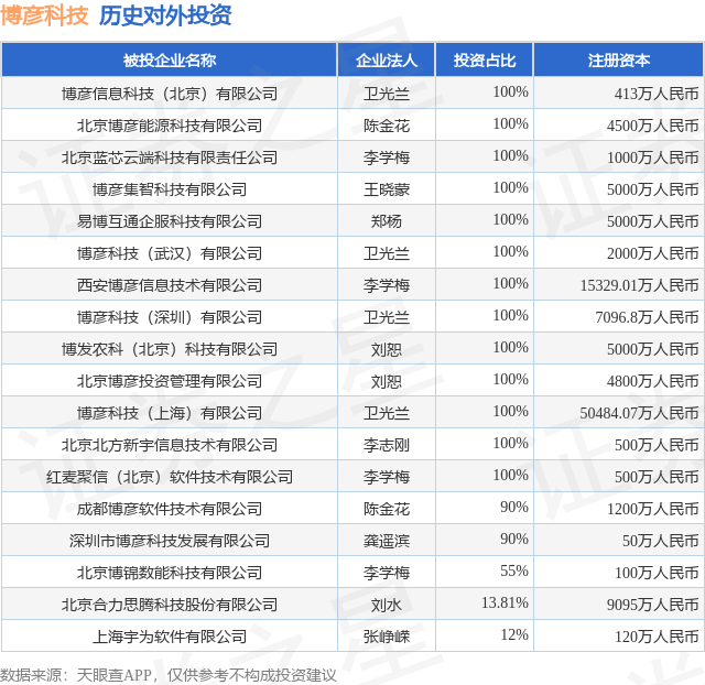 证券之星消息,根据天眼查APP显示,博彦科技(002649.SZ)新增一起对外投资事件,被投资公司为北京博锦数能科技有限公司,法定代表人李学梅,投资占比为55%。该公司从事软件和信息技术服务业,注册资本为100万人民币。目前,博彦科技共存在对外投资18项,详见下表: