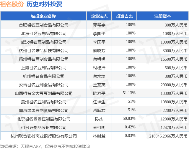证券之星消息,根据天眼查APP显示,祖名股份(003030.SZ)新增一起对外投资事件,被投资公司为合肥祖名豆制食品有限公司,法定代表人邓帮宇,投资占比为100%。该公司从事食品制造业,注册资本为308万人民币。目前,祖名股份共存在对外投资14项,详见下表: