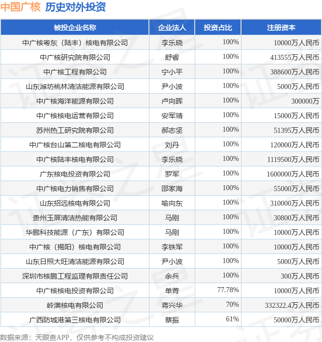 证券之星消息,根据天眼查APP显示,中国广核(003816.SZ)新增一起对外投资事件,被投资公司为中广核粤东(陆丰)核电有限公司,法定代表人李乐晓,投资占比为100%。该公司从事电力、热力生产和供应业,注册资本为10000万人民币。目前,中国广核共存在对外投资30项,投资占比前20的项目见下表: