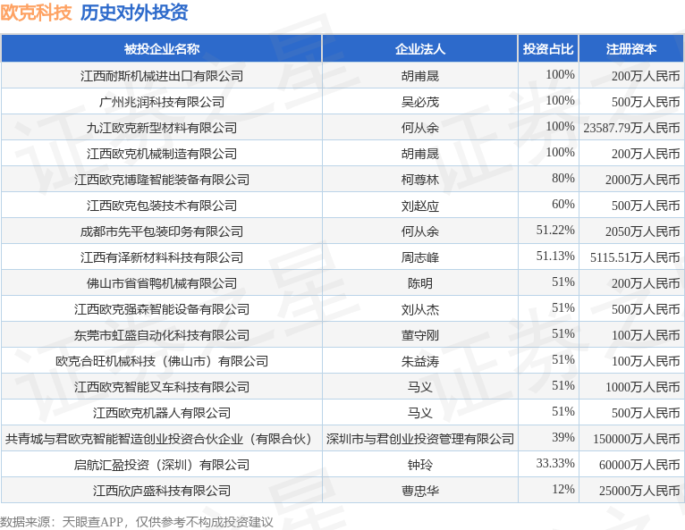 证券之星消息,根据天眼查APP显示,欧克科技(001223.SZ)新增一起对外投资事件,被投资公司为江西欣庐盛科技有限公司,法定代表人曹忠华,投资占比为12%。该公司从事电气机械和器材制造业,注册资本为25000万人民币。目前,欧克科技共存在对外投资17项,详见下表: