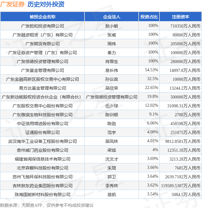 通过天眼查大数据分析,广发证券股份有限公司共对外投资了116家企业,参与招投标项目1960次;财产线索方面有商标信息434条,专利信息152条,著作权信息82条;此外企业还拥有行政许可36个。据2024年报数据,广发证券商誉240.3万元,同比增2.18%。长期股权投资110.07亿元,同比增19.31%。