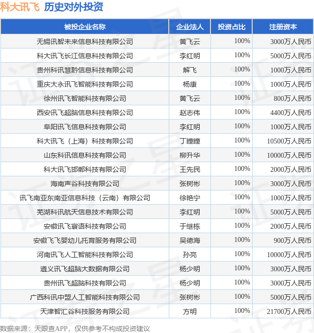 证券之星消息,根据天眼查APP显示,科大讯飞(002230.SZ)新增一起对外投资事件,被投资公司为无锡讯智未来信息科技有限公司,法定代表人黄飞云,投资占比为100%。该公司从事软件和信息技术服务业,注册资本为3000万人民币。目前,科大讯飞共存在对外投资116项,投资占比前20的项目见下表: