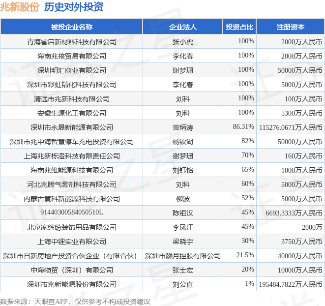 证券之星消息,根据天眼查APP显示,兆新股份(002256.SZ)新增一起对外投资事件,被投资公司为海南兆维能源科技有限公司,法定代表人刘钰铭,投资占比为65%。该公司从事土木工程建筑业,注册资本为1000万人民币。目前,兆新股份共存在对外投资18项,详见下表: