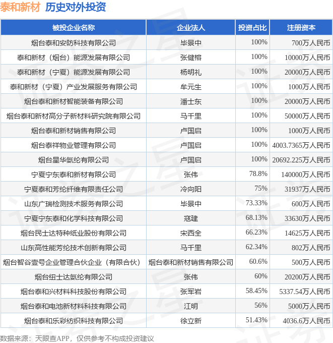 证券之星消息,根据天眼查APP显示,泰和新材(002254.SZ)新增一起对外投资事件,被投资公司为烟台泰和安防科技有限公司,法定代表人毕景中,投资占比为100%。该公司从事专业技术服务业,注册资本为700万人民币。目前,泰和新材共存在对外投资31项,投资占比前20的项目见下表: