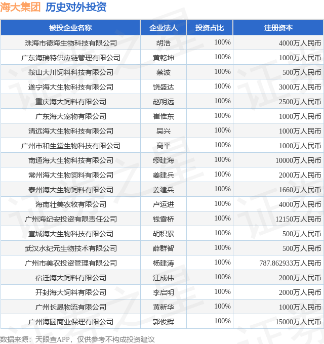 证券之星消息,根据天眼查APP显示,海大集团(002311.SZ)新增一起对外投资事件,被投资公司为珠海市德海生物科技有限公司,法定代表人胡浩,投资占比为100%。该公司从事科技推广和应用服务业,注册资本为4000万人民币。目前,海大集团共存在对外投资209项,投资占比前20的项目见下表: