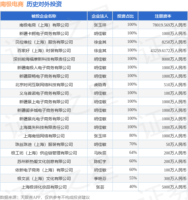 证券之星消息,根据天眼查APP显示,南极电商(002127.SZ)新增一起对外投资事件,被投资公司为上海合光时代文化创意有限公司,法定代表人胡佳敏,投资占比为-。该公司从事文化艺术业,注册资本为100万人民币。目前,南极电商共存在对外投资23项,投资占比前20的项目见下表: