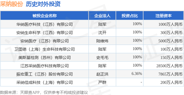 证券之星消息,根据天眼查APP显示,采纳股份(301122.SZ)新增一起对外投资事件,被投资公司为华纳医疗科技(江苏)有限公司,法定代表人陆军,投资占比为100%。该公司从事医药制造业,注册资本为1000万人民币。目前,采纳股份共存在对外投资8项,详见下表: