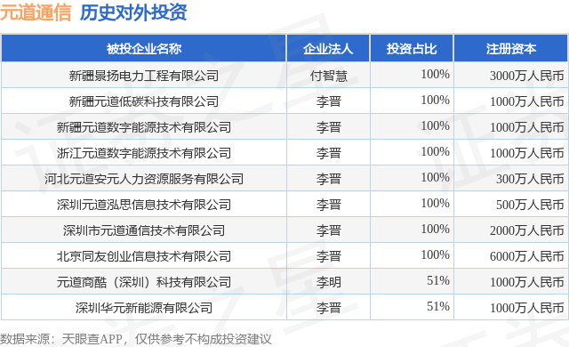 证券之星消息,根据天眼查APP显示,元道通信(301139.SZ)新增一起对外投资事件,被投资公司为新疆景扬电力工程有限公司,法定代表人付智慧,投资占比为100%。该公司从事土木工程建筑业,注册资本为3000万人民币。目前,元道通信共存在对外投资10项,详见下表: