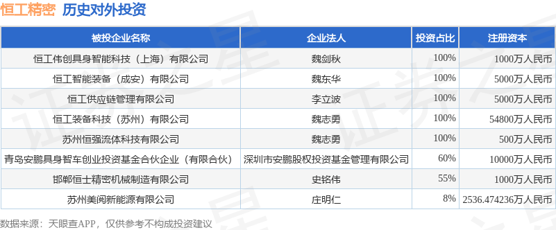 证券之星消息,根据天眼查APP显示,恒工精密(301261.SZ)新增一起对外投资事件,被投资公司为恒工伟创具身智能科技(上海)有限公司,法定代表人魏剑秋,投资占比为100%。该公司从事计算机、通信和其他电子设备制造业,注册资本为1000万人民币。目前,恒工精密共存在对外投资8项,详见下表: