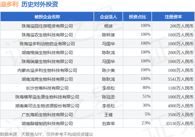证券之星消息,根据天眼查APP显示,溢多利(300381.SZ)新增一起对外投资事件,被投资公司为珠海溢园住房租赁有限公司,法定代表人杨波,投资占比为100%。该公司从事房地产业,注册资本为200万人民币。目前,溢多利共存在对外投资12项,详见下表: