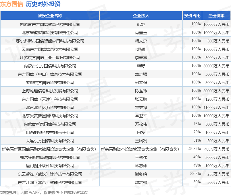 证券之星消息,根据天眼查APP显示,东方国信(300166.SZ)新增一起对外投资事件,被投资公司为内蒙古东方国信智算科技有限公司,法定代表人韩野,投资占比为100%。该公司从事软件和信息技术服务业,注册资本为10000万人民币。目前,东方国信共存在对外投资32项,投资占比前20的项目见下表: