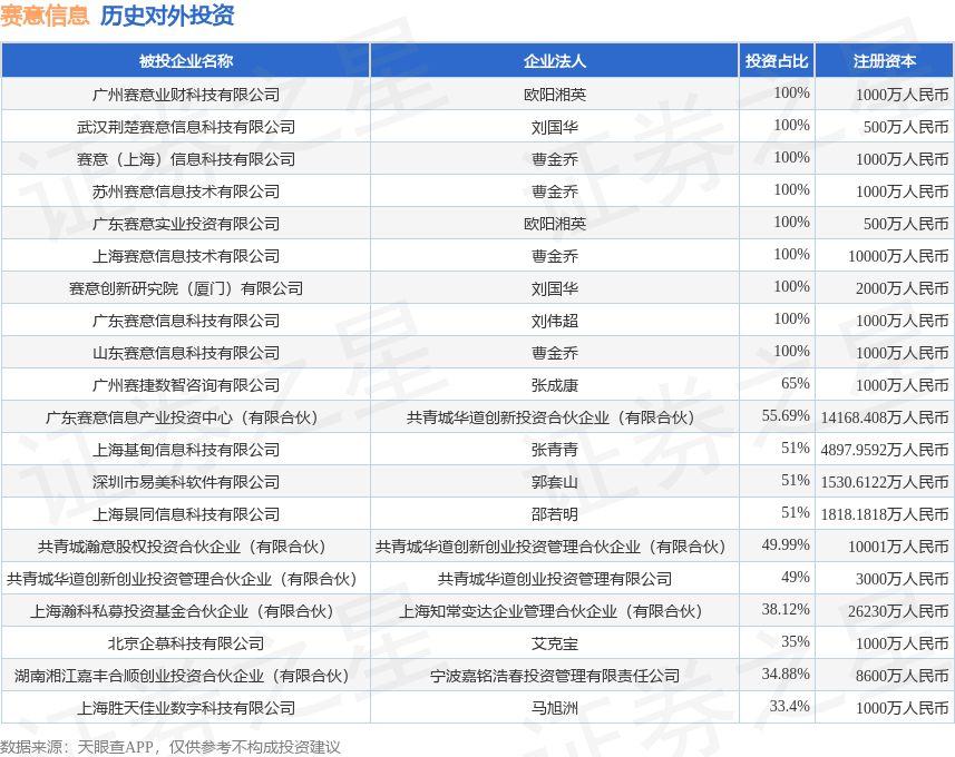 证券之星消息,根据天眼查APP显示,赛意信息(300687.SZ)新增一起对外投资事件,被投资公司为深圳中显联合六号投资企业(有限合伙),法定代表人北京航宸企业管理咨询有限公司,投资占比为33.24%。该公司从事资本市场服务,注册资本为14.98万人民币。目前,赛意信息共存在对外投资29项,投资占比前20的项目见下表: