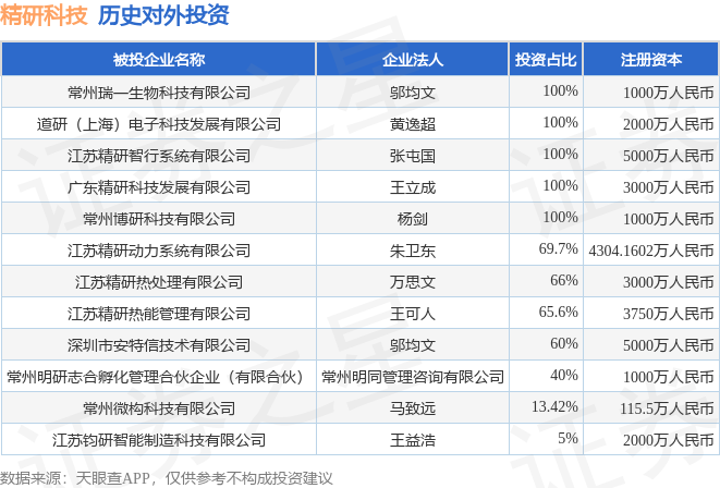 证券之星消息,根据天眼查APP显示,精研科技(300709.SZ)新增一起对外投资事件,被投资公司为常州瑞一生物科技有限公司,法定代表人邬均文,投资占比为100%。该公司从事研究和试验发展,注册资本为1000万人民币。目前,精研科技共存在对外投资12项,详见下表: