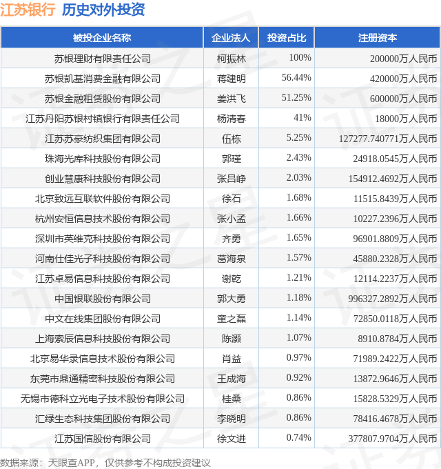 证券之星消息,根据天眼查APP显示,江苏银行(600919.SH)新增一起对外投资事件,被投资公司为珠海光库科技股份有限公司,法定代表人郭瑾,投资占比为2.43%。该公司从事计算机、通信和其他电子设备制造业,注册资本为24918.0545万人民币。目前,江苏银行共存在对外投资37项,投资占比前20的项目见下表: