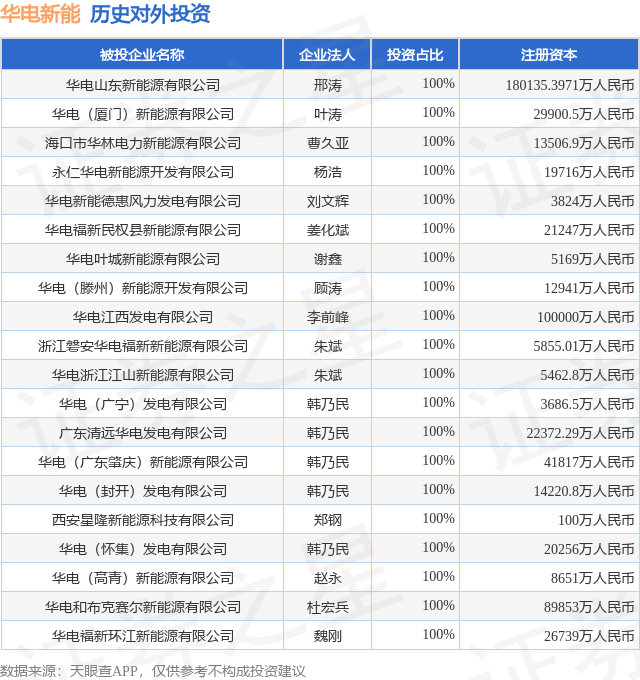 证券之星消息,根据天眼查APP显示,华电新能(600930.SH)新增一起对外投资事件,被投资公司为华电(涡阳)风力发电有限公司,法定代表人杨巨山,投资占比为90%。该公司从事电力、热力生产和供应业,注册资本为1000万人民币。目前,华电新能共存在对外投资552项,投资占比前20的项目见下表:
