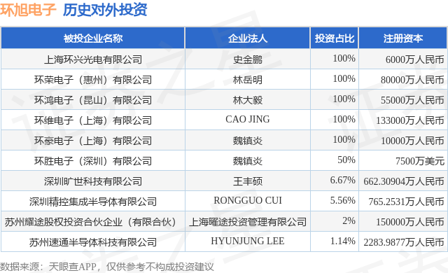 证券之星消息,根据天眼查APP显示,环旭电子(601231.SH)新增一起对外投资事件,被投资公司为上海环兴光电有限公司,法定代表人史金鹏,投资占比为100%。该公司从事计算机、通信和其他电子设备制造业,注册资本为6000万人民币。目前,环旭电子共存在对外投资10项,详见下表:
